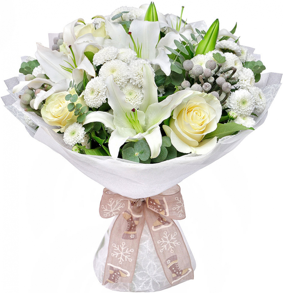 Нежнейший букет из белых лилий, роз и хризантем - это ода чистой любви и искренности, истинной красоте и душевной чистоте. Такой букет станет достойным подарком в День свадьбы или для другого торжества. Своим великолепием и нежностью он очарует каждую женщину, подарит радость и прекрасное настроение.