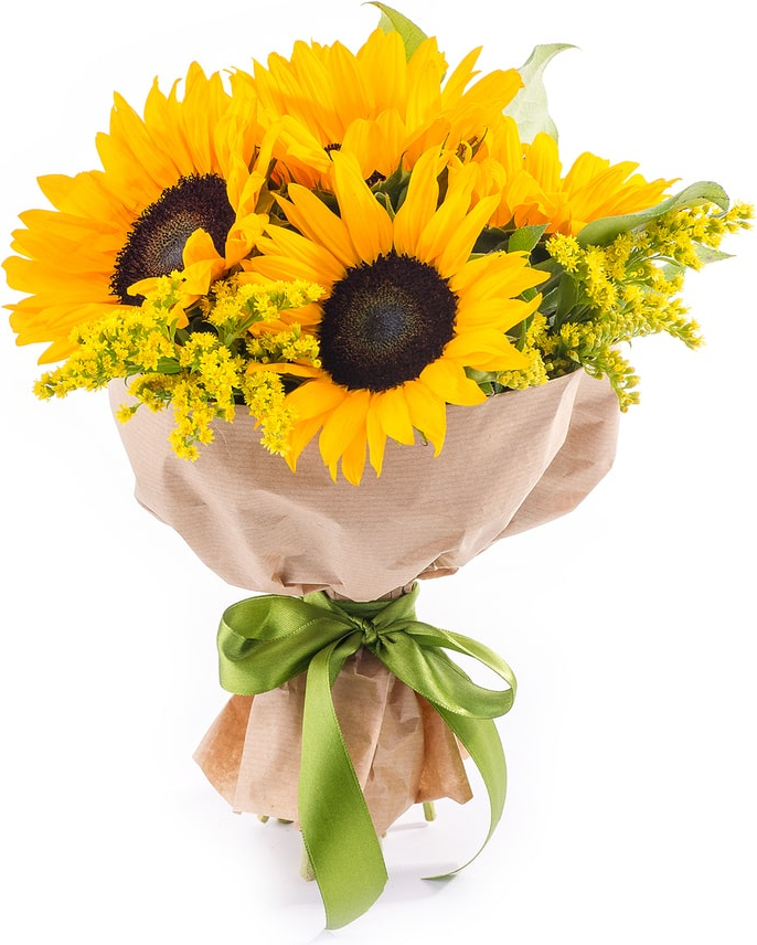 1 подсолнух, 2 солидаго, упаковка, лента3 подсолнуха, 2 солидаго, упаковка, лента5 подсолнухов, 4 солидаго, упаковка, лента
